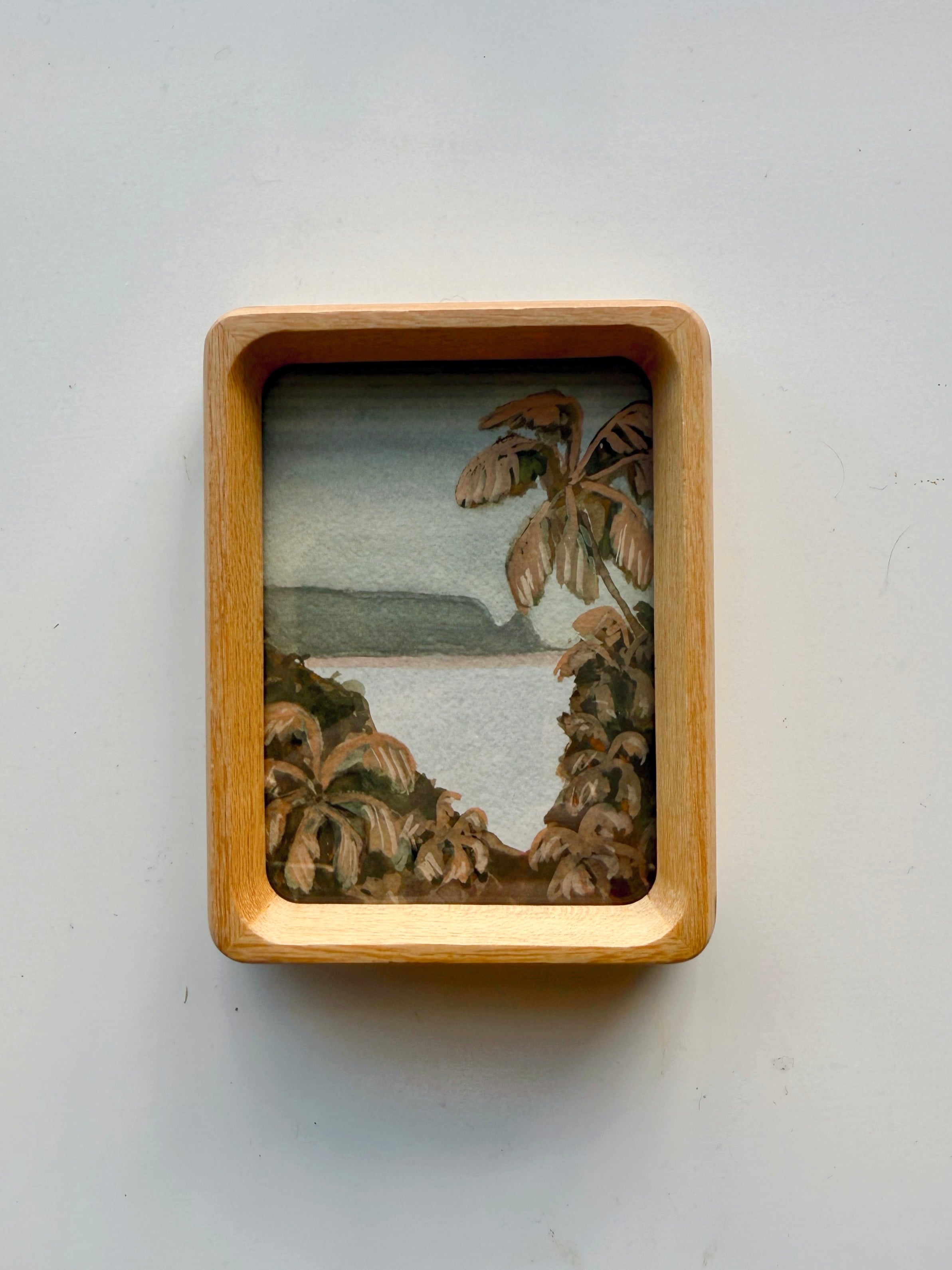 An original watercolor painting of Kauai’s iconic Makana in the distance as seen from Princeville. This is a mini watercolor, painted on handmade cotton watercolor paper and comes in a 3x4 wooden frame.