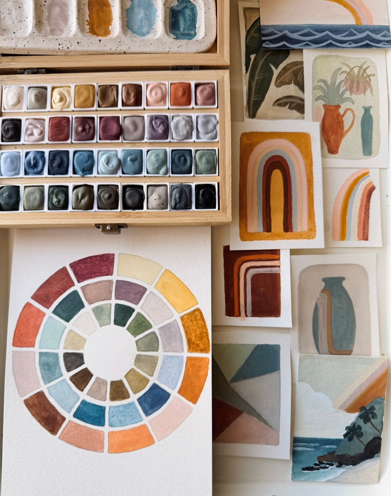 The Paintbox Set comes with 36 colors in four rows in a beautiful wooden box. All of our watercolors are made using the highest quality, artist grade pigments and have excellent lightfastness.