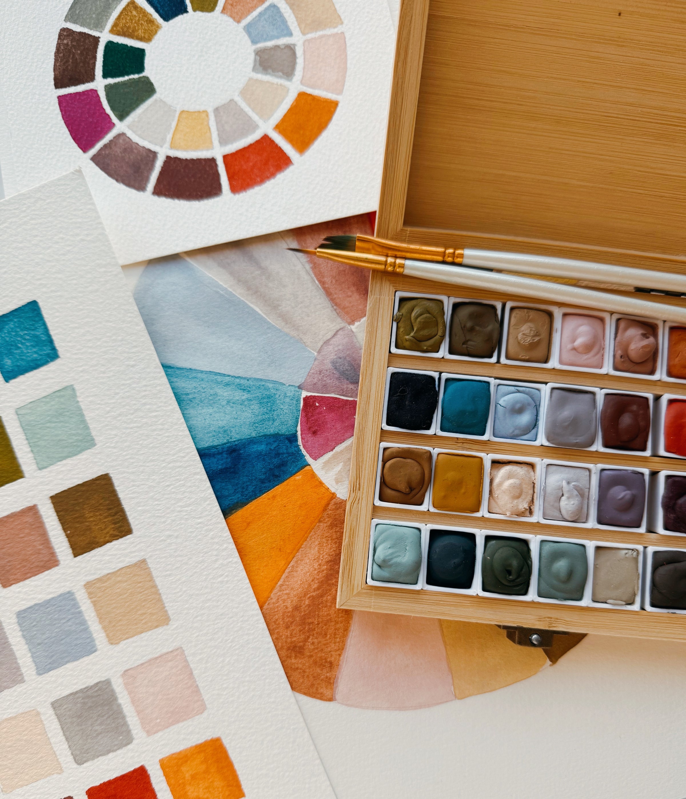 This new paintbox version of our classic Salt + Sand set comes with 24 colors in four rows in a beautiful bamboo wood box. All of our watercolors are made using the highest quality pigments and are artist grade and most have excellent lightfastness.